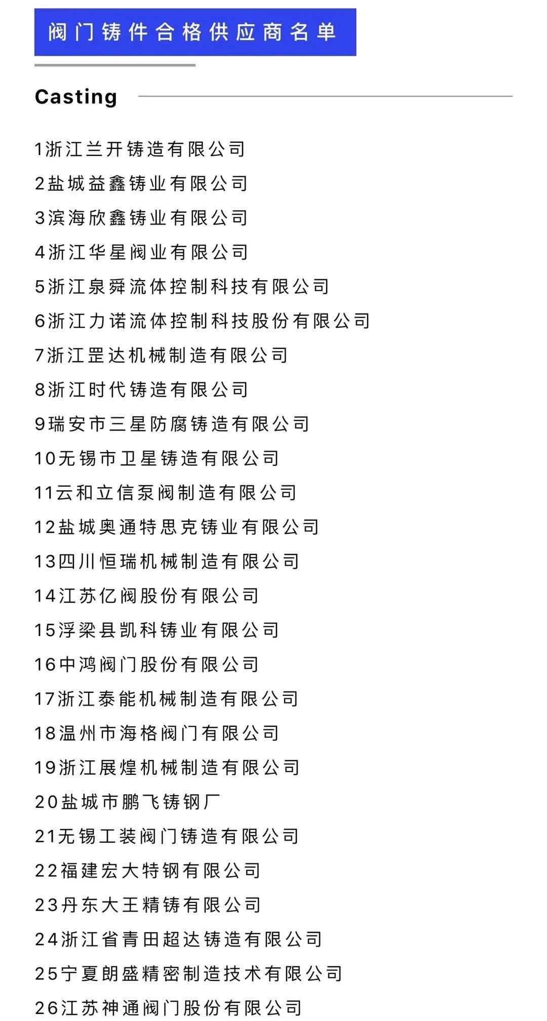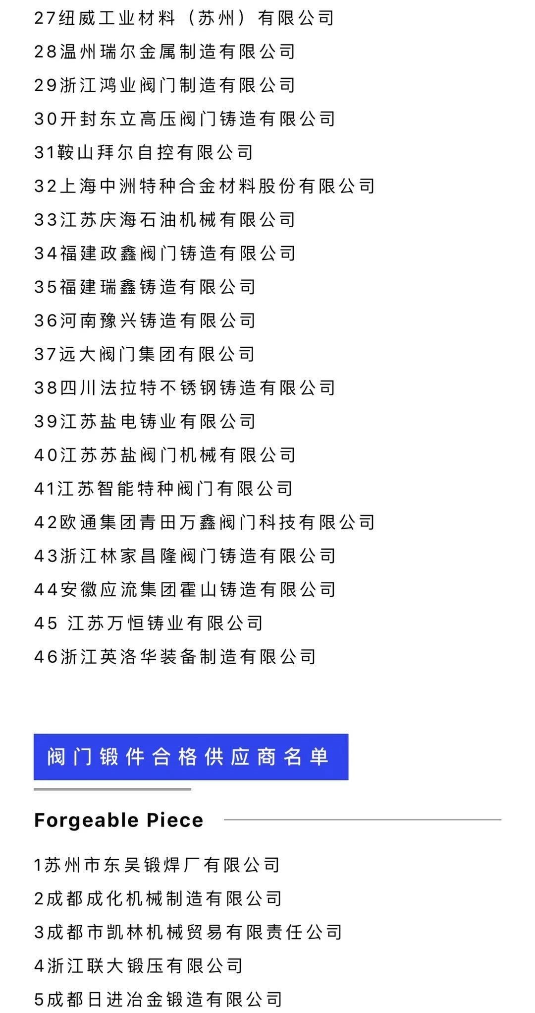 年度中国石化阀门铸锻件合格供应商名单已出炉